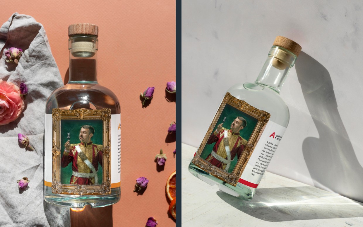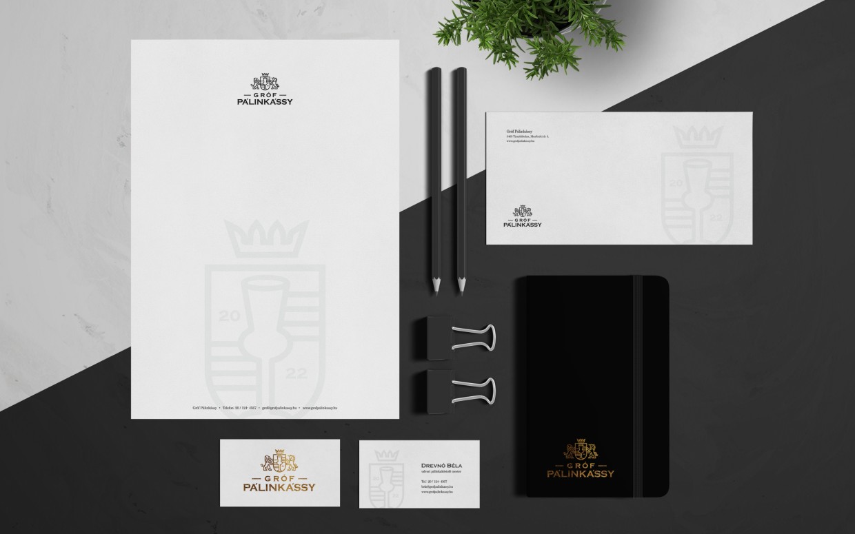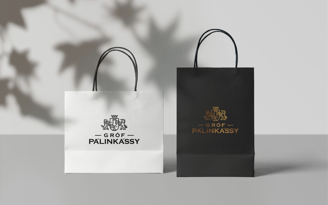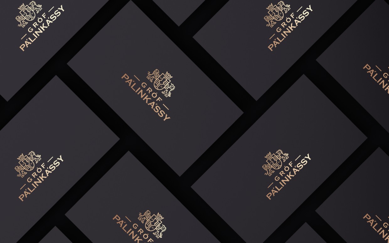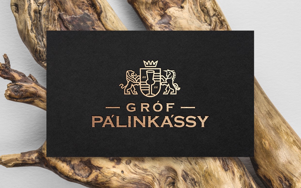 Az embléma egy fiktív grófi címert ábrázol, természetesen a heraldika mentén. Az erőt sugárzó oroszlán mellett egy unikornis is feltűnik, ami a márka egyediségére, kedélyességére utal. És mindketten a pálinkás poharat őrzik a címerben. A logó egyszerre idézi meg a klasszikus formavilágot, de mégis modern, karakteres hangulatú. Az arculat sokszínűsége a termékek csomagolásán köszön vissza igazán.