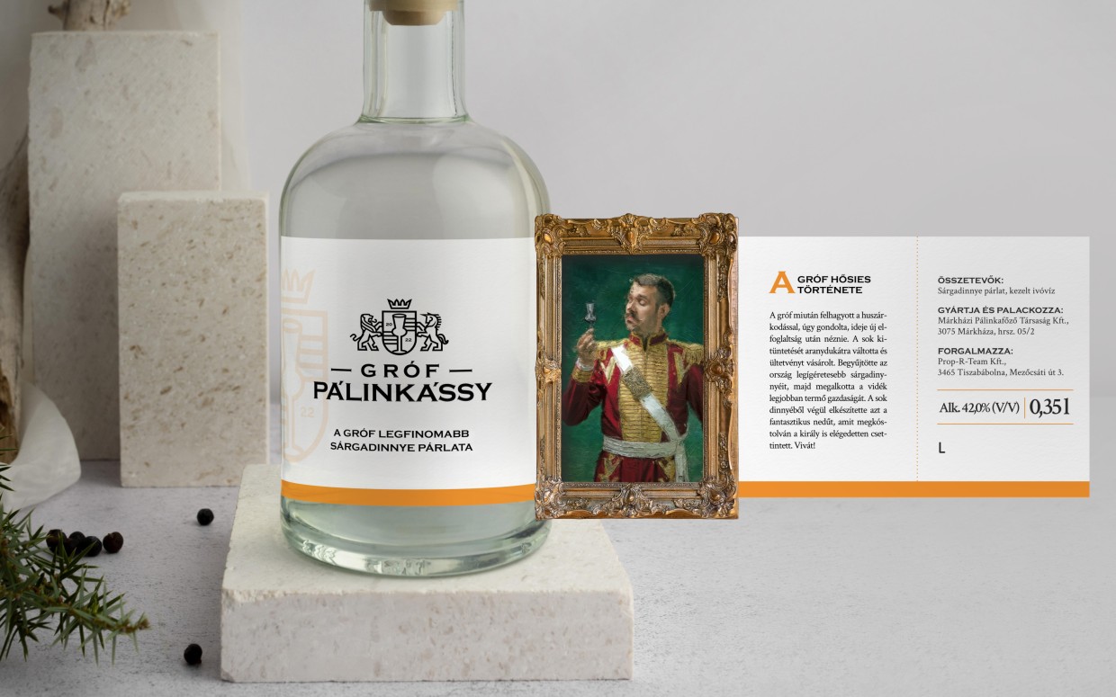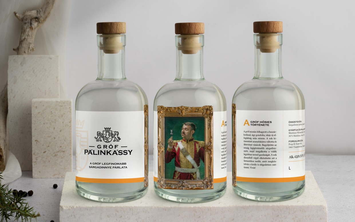 A Gróf Pálinkássy egy limitált pálinka márka. A márkanév egy szójátékon alapul, melyben a pálinka szó van átalakítva, hogy nemesi hangzású legyen. A dupla s betűk és a szóvégi y grófi rangot ad a névnek. Ezt a bohém, mégis prémium irányt terveztük meg a brand számára.