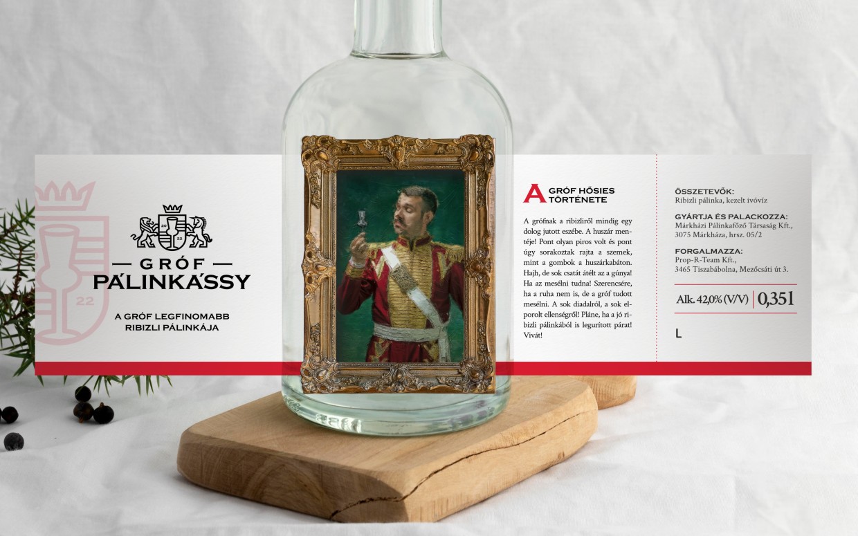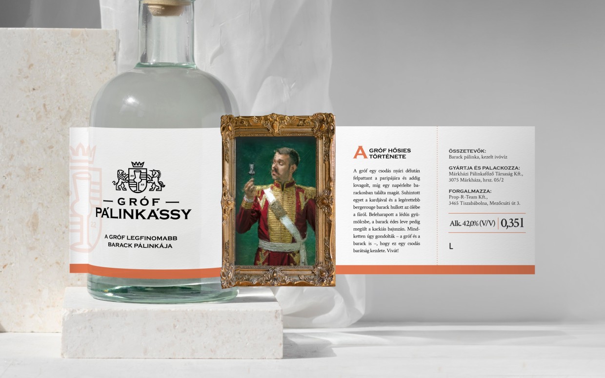 A csomagoláson megismerhetjük magát a Grófot is, persze csak stílusosan, egy autentikus olajfestményen keresztül. A címkék termékspecifikus történetet is rejtenek, az adott ízhez, pálinkához igazítva. Ezek a Gróf hősies tetteit örökítik meg. Mindezt nemesi stílusjegyekkel és grófi szófordulatokkal tarkítva.